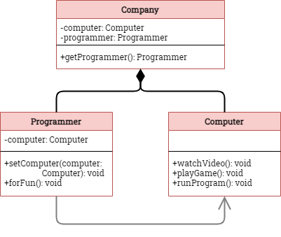 public class Company { Computer computer; Programmer programmer; public Programmer getProgrammer(){ computer = new Computer(); programmer = new Programmer(computer); return programmer }}