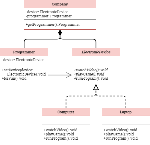 public class Company { ElectronicDevice device; Programmer programmer; public Programmer getProgrammer(){ device = new Laptop(); programmer = new Programmer(device); return programmer }}