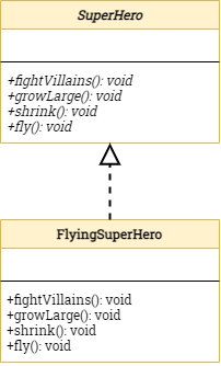 class FlyingSuperHero implements SuperHero { void fightVillains() { System.out.println("打擊壞人!"); } void growLarge(){} void shrink(){} void fly() { System.out.println("我是會飛的英雄"); }}