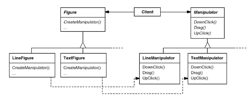- 替子類別預留掛鉤(Provides hooks for subclasses),以Factory Method的類別產生物件比直接產生物件更有彈性,只要Override他的方法,就能生成特殊的物件。連接平行地位的類別階層(Connects parallel class hierarchies)。一般來說,Factory Method只會被Creator引用,但不一定非得如此,也可以用在平行地位類別階層的關係。如下圖所示,Figure和Manipulator會平行地各自發展。每個Figure類別預留相對應的Factory Method CreateManipulator(),讓Client能建立與Figure相對應的Manipulator。Figure也可以將自己的CreateManipulator()寫成回傳一個預設的Manipulator物件實體。可以理解為:ConcreteCreator 跟 ConcreteProduct 會成對的增加。