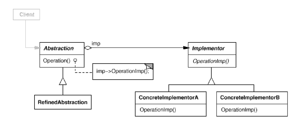 Collaborations: Abstraction將Client的訊息請求轉傳給對應的Implementor去處理。
