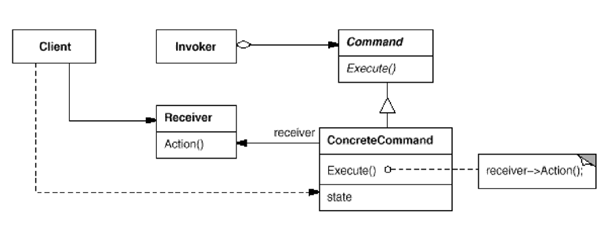 - Receiver物件,負責實際執行所要求的命令。餵給Receiver對應操作的參數。在執行操作後,所有可能有變動的Receiver原始內容。Receiver必須提供某些操作以供復原。