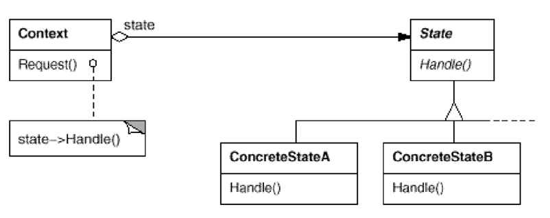 - 集中處理與狀態相依的行為並予以切割。只要定義新的State子類別,即可輕易增加新的狀態及狀態轉移邏輯。替每一種狀態設一個State物件,能突顯狀態轉移邏輯,也能避免Context不一致的內部狀態。(以Context來看,狀態轉移是個不可再細分的atomic動作)狀態物件可共用。若State物件不含實例變數,則Context可以共用State物件,此時State物件相當於沒有內在狀態、只有行為的Flyweight物件。