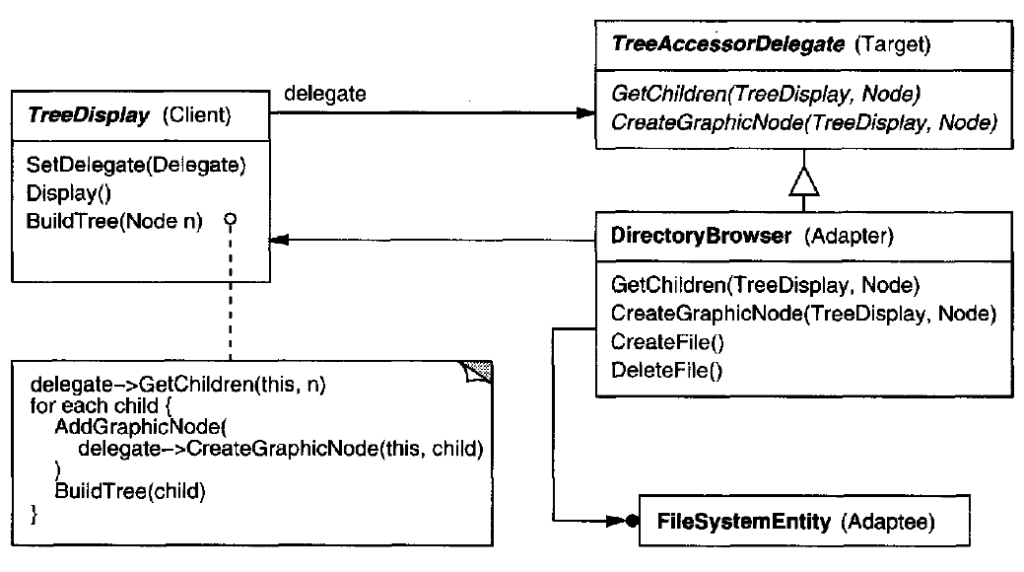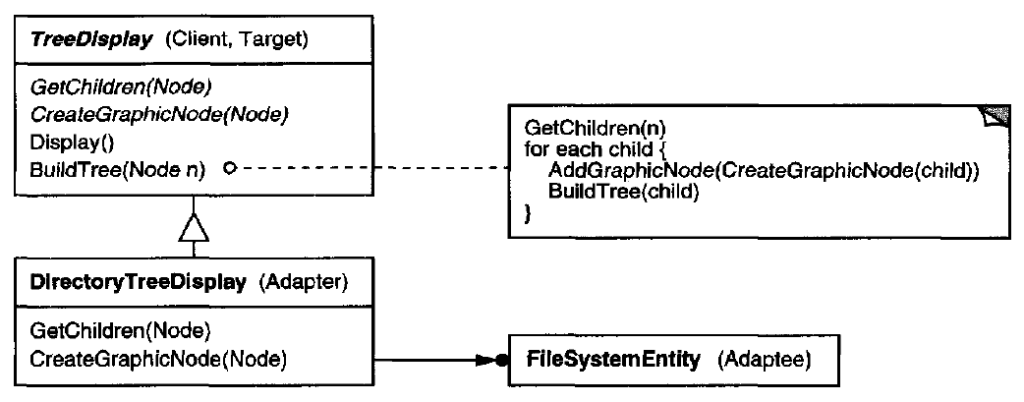 - 用抽象操作:在TreeDisplay裡將窄介面定義成抽象操作,TreeDisplay的子類別負責讓這些操作能處理對應的Adaptee(如:FileSystemEntity)之操作。